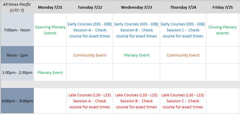 - We recommend that attendees choose only one early course and one late course, due to conflicting course times.