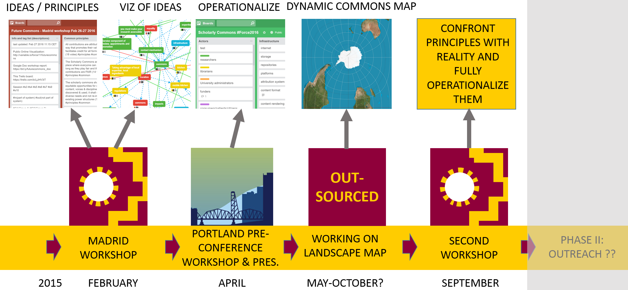 We submitted a set of related proposals to FORCE2017. As a concept, model and research ecosystem, Scholarly Commons cuts to the core of the FORCE11 project. It interrogates and re-evaluates all of the FORCE2017 themes: increasing diversity, building new workflows, business models/sustainability, new forms of communication, outreach, and rewards and incentives. It also mirrors the FORCE2017 meeting trajectory as it encompasses the Past, the Future and Next Steps structure that the organising committee is seeking.-
